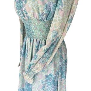 Beautiful vintage-inspired blue floral maxi dress with a dreamy pastel palette and romantic silhouette. This piece features sheer long sleeves, smocked waist and cuffs, and a full flowing skirt. The fabric is semi-sheer and unlined. Tag is missing—please refer to measurements for best fit.