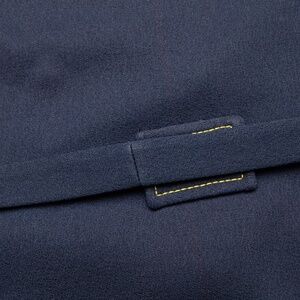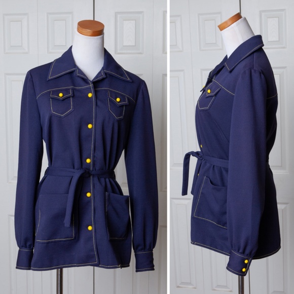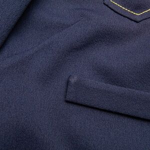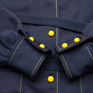 navy blue medium weight polyester with some stretch, yellow stitching & button accents, fabric belt