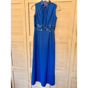 Vintage 70s Royal Blue Sequin Trim Maxi Dress Size Small