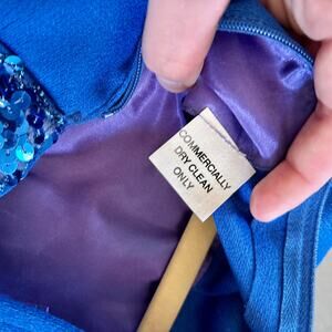 Fitted A-line royal blue sleeveless gown with sequin trim at the mock neckline and waist. Features a long zipper in back and small slit at the hem. Ideal for formal occasions or retro-themed events. Note: Two faint spots on chest and some interior underarm discoloration (see photos) – priced accordingly.