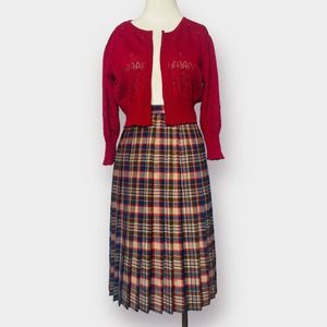 Vintage 70s Blue Red Tan Orange Pleated Wool Midi Skirt