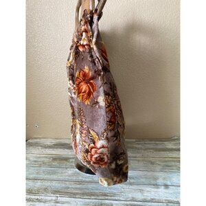 Bring back vintage boho flair with this 1970s floral carpet bag, featuring a velour upholstery fabric in warm autumn shades of brown, gold, orange, and cream.