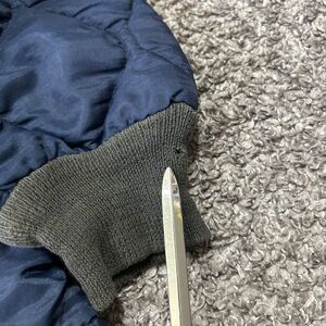 See photos. Fabric shows wear, some tiny holes and the bottom of the zipper is a bit loose but still fully functioning. Cuffs are mismatched. Super cozy piece with an older zipper, likely 1970s. Size fits about a mens small/medium best. Please refer to measurements for accurate fit