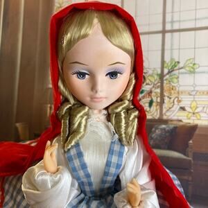This Bradley "pose" doll is dressed as the storybook (fairy tale) character of Little Red Riding Hood. Made in Korea, this ca. 12-inch stockingette doll comes with original box. She comes with all seen here, from her blue and white gingham outfit and red cape, to her doll stand (to which she is permanently affixed). Very good, preloved condition. Her skirt will need a little fluffing after removing her from her box and her face needs a little cleaning, but overall her costume and hair are in amazing condition!