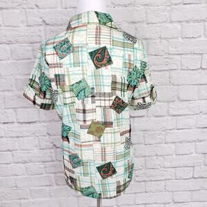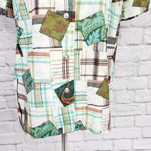 Vintage '70s Bradley Knitwear Green Plaid Patchwork Print Button Down Top Size M