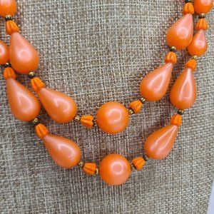 Vintage 70s Bright Double Strand Coral Orange Moonglow Lucite and Glass Necklace