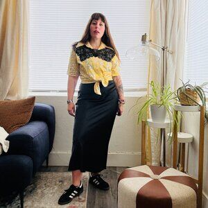 Details- This is a vintage 1970s era bright yellow geometric printed button-down short sleeved shirt by Inseparables by Jacques. It’s got a dagger collar that’ll poke an eye out! Technically a men’s shirt (buttons are on the opposite of a women’s top) but gender is a construct wear whatever tf you like.
