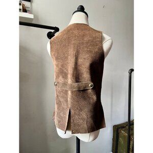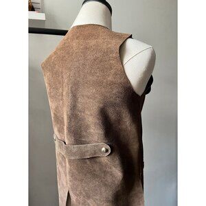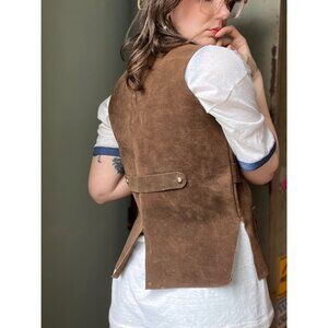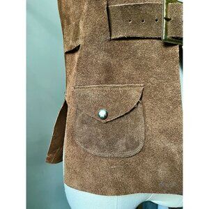 Killer 70s brown genuine leather suede belted vest. Features 2 flap pockets at the waist, 2 faux pockets at the chest, attached belt, buckle fastening at the natural waist. Slits on either side and in the back for easy movement, freshly polished brass hardware throughout. Artisan made, no material or brand tags so please refer to measurements for accurate sizing. Very cool, very high quality leather piece! It's in truly excellent condition.