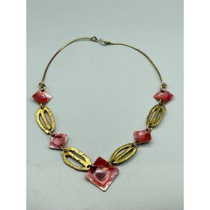 Vintage 70s Brutalist Necklace Handcrafted Brass & Enamel Statement Jewelry