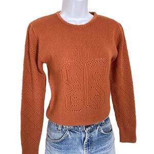 Adorable vintage 1970s burnt orange color soft acrylic knit butterfly accent sweater. No flaws found. Great shape. Will best fit a modern XS/S. Sweater will stretch a bit.Will have a more fitted look. So cute. Questions? Please ask. All sales final. No returns accepted. No refunds. Thanks so much for looking.