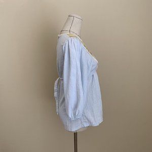 Vintage 70s homemade unbranded patchwork front bib prairie cottage core style puff sleeve top. Lace edging. Zips up the back and ties in the back. No labels so not sure of time period but appears to be 70s. Great preworn condition, there are some white spots in the fabric almost like bleach spots, please see photos. Fabric has a gauzy texture. Shirt is light blue with brown hues in the patchwork bib front.