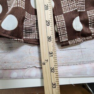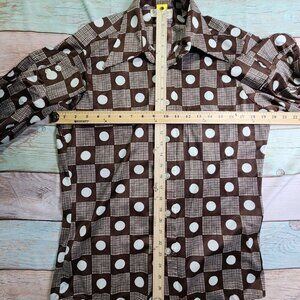 Step into the groovy era with this bold geometric print shirt. Designed by Capri California, it whispers 70s charm with every thread. The smooth brown and white pattern captures a retro vibe, ensuring you stand out in style. A piece that carries stories of a decade known for its iconic fashion.