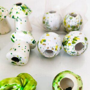 Vintage 70s Ceramic Frog Mushroom Macrame Beads Set of 15 Mid-Century Modern