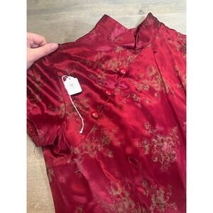 Stunning vintage 1970s Dynasty Joy Fashions cheongsam-style dress. Crafted in a rich red satin with gold floral brocade detailing, this piece captures timeless elegance and cultural inspiration. Features a high mandarin collar, asymmetrical button closure at the chest, short sleeves, and a slim silhouette that falls to full maxi length.