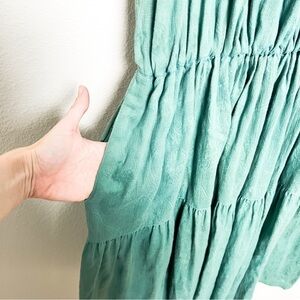 Vintage 70s Boutique Label Christian Joss green tapestry floral pocket dress