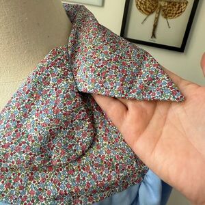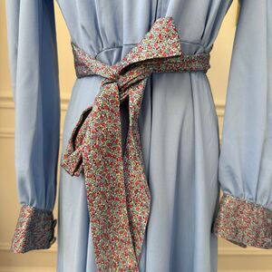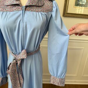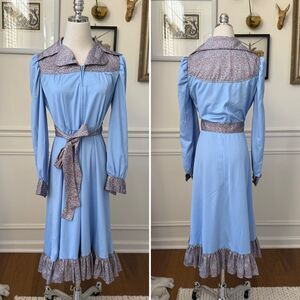 This little number is so old school Square dance country western and 70s Dolly Parton or even earlier Patsy Cline! It feels like polyester fabric, but there are no tags. Notched spread collar that comes to a point and calico inlay trim across the front yoke, cuff, attached sash and ruffle hem. Half zip front. Solid blue balance. Talon zipper. Laying flat measures 18 inches armpit to armpit, 14 inches straight across the waist untied, 24 inches across the hip and 41 inches shoulder to hem. Based on the measurements, I estimate this to be approximately a modern size small but it could flex into a smaller size medium. Please double check the measurements to ensure the proper fit for you.