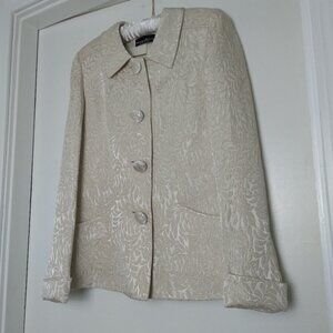 * Lovely cream colored satin finish brocade with raised swirling leaf pattern * Four 1" covered Buttons. A pointed circular collar tops this straight cut blazer.