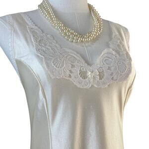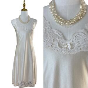 Vintage 70s Creamy White Satin Nylon Lace & Bow Full Slip Dress Women's Size M