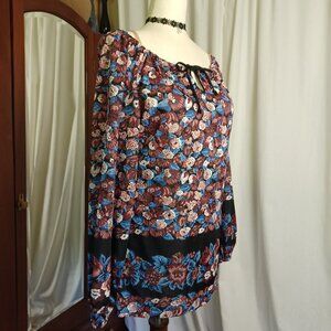True 70s vintage dark floral top with adjustable drawstring neckline!