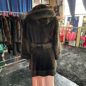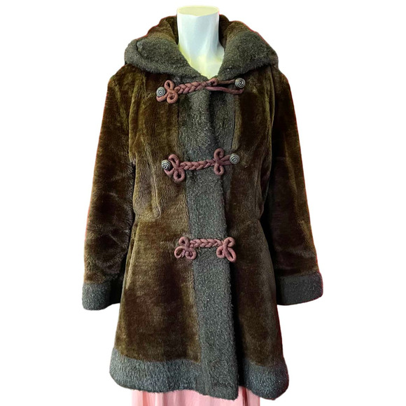 Vintage 70s Brown Faux Fur Coat with Frog Closures and Hood Cozy up this winter with this deep, rich, chocolate brown faux fur coat. From wide hood to mid-thigh hem, you'll be fully enclosed in teddybear softness.