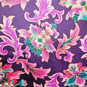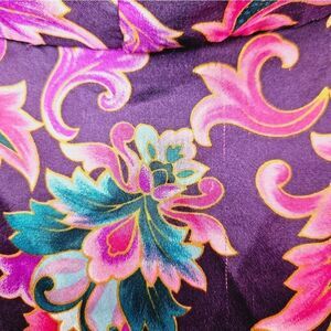 You'll feel ready to seduce the pool boy in this luxurious satin vintage robe from Dentelle. If there is no pool boy in sight this would also be a great bridal robe... It has a beautiful vibrant floral pattern and silky feel that will make you feel like a million bucks! Don't let this vintage piece pass you by! Made with a luscious floral print on a deep purple background. Fastened with a intricate knot style button in the front. There is a space for a sash but this does not come with one.
