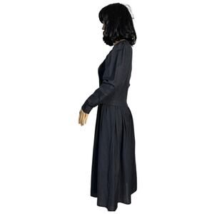 Beautiful vintage black linen dress by Diane Von Furstenberg, nice more fitted bodice and fuller skirt and long sleeves. Very nice detail of the front chest and fuller sleeves at shoulders.