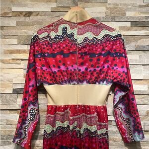 Straight from my mother’s closet, this true vintage gem is a 1970s disco queen dream. With its bold psychedelic print, dramatic front panel, and flirty waist cutouts, this maxi dress brings the perfect mix of Studio 54 glam and mod revival chic.