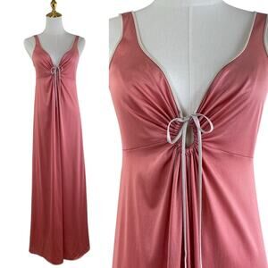 Vintage 70s Disco Vassarette Copper Nylon Keyhole Maxi Slip Dress Long Slinky Nightgown with Cream Piping and Keyhole Tie