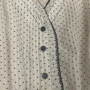This dreamy vintage dress is a 1970s romantic revival piece that channels all the feminine charm of a 1950s summer day dress. Designed by Jerrie Lurie and likely made in the USA, it features a soft, semi-sheer white fabric with delicate navy swiss dots, pintuck texture, and navy trim. No size label — see measurements for best fit. Estimated fit: Small to Large, depending on desired style and shape.