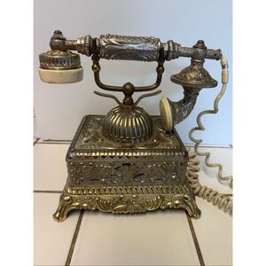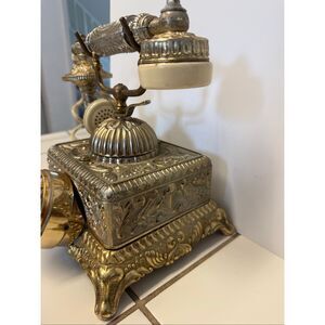 Designed in a Victorian baroque style, this ornate piece is crafted with brass-toned metal detailing and intricate engravings, giving it an air of sophistication and old-world charm. The classic rotary dial adds a nostalgic touch, making it both a functional phone and a decorative statement piece. Perfect for collectors of vintage telephones, Victorian-inspired décor enthusiasts, or anyone looking to add a unique accent to their home or office.