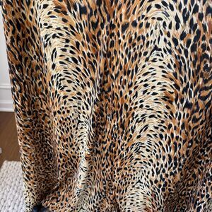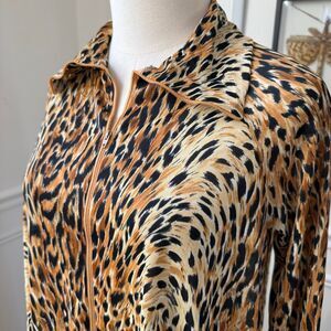 70s Vintage Elaine Skylar Cheetah print half zip caftan kaftan muumuu. Collar. Long sleeve 100% nylon and machine washable. Tag size medium. One on seam hip pocket. I believe this is meant to be more of a housecoat but it’s pretty opaque and I would wear it out of the house. Laying flat measures 55 inches shoulder to him, 20 inches armpit to armpit and 26 inches across the hip.
