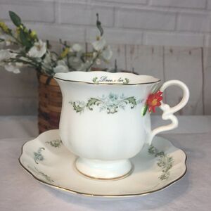 Vintage 70s Enesco December Dainty Green Floral Bone China Teacup Set