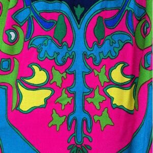 Retro vintage 1970's maxi skirt by FEINER FASHIONS. 100% acrylic crepe fabric (commonly called barkcloth because of the texture) was wildly popular from the 1950's-1970's because of its incredible color saturation and wild retro patterns. Commonly used to make Hawaiian garments of that time it was manufactured in Japan or Hawaii. Psychedelic design in highlighter bright colors with matching fabric-covered buttons down the front. Waistband snap closure & single pocket. Good vintage condition - there's a small amount of pilling/wear.