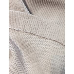 Single stitch hem, caramel tan brown color, ribbed knit fabric, high neckline, puff sleeves with elastic wrist, embroidered edetails along chest, back zip closure, no material tag.