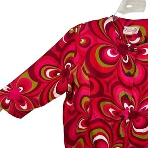 Vintage 70s Flower Power Red Mandarin Collar Half Sleeve Button Front Tunic M