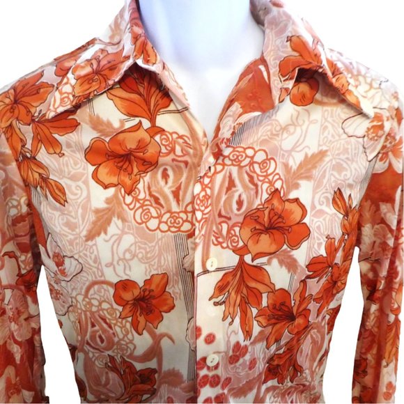 Vintage 70s Frankenstein Disco Polyester Floral Shirt Pointed Dagger Butterfly