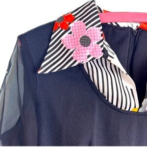 This incredible maxi dress features a bold 70s floral print, black and yellow belting at the waist, sheer puffy sleeves and alllll of the attitude!