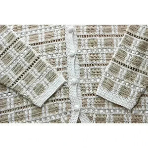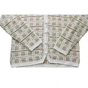Add a touch of retro charm to your wardrobe with this vintage 70s Garland cardigan sweater in ivory and cream. The open-knit style, plaid pattern, and V-neckline provide a bohemian and classic look that is perfect for any occasion. The lightweight and breathable features make it ideal for the summer or a layering piece in the winter. This women's size L sweater is made of a soft and comfortable ramie and cotton material with a button closure. The cardigan is perfect for those who love art and vintage fashion. It is a must-have addition to any wardrobe, and its timeless design makes it perfect for pairing with any outfit.