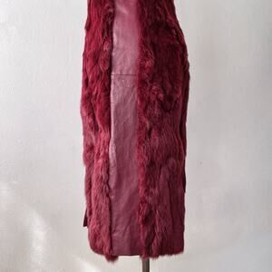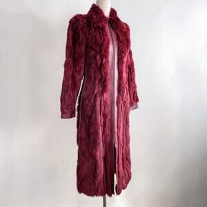 Vintage 70s Genuine Rabbit Fur & Leather Coat Long Jacket Sz M Maroon Burgundy