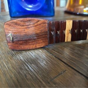 Enhance your style with this beautifully crafted 70’s vintage wooden belt featuring a striking geometric inlay design. The rich brown 2 tone and intricate wooden links give off bohemian vibes . Adjustable click belt. Vintage belt in good condition. Measures 37” in length.