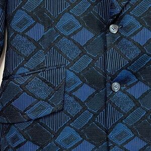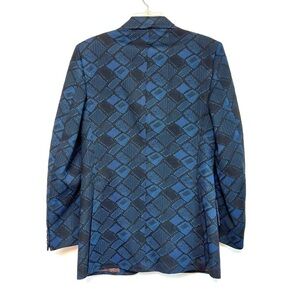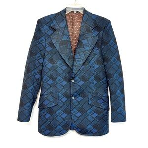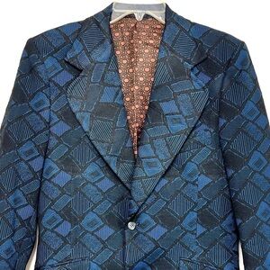 Rare Vintage 70’s Geometric Mod Brocade Blazer Suit Jacket. Michael D Shops for Men, Made in Detroit. Funky cobalt blue geometric pattern. Fits like a Mens Small possibly a medium. See measurements below.