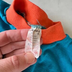 Vintage girl's turquoise flower appliqué long sleeve shirt. A cute blue and orange knit flower attached at chest. Orange ribbed mock neck and single stitched. In good vintage condition with light pilling. See photos. Marked a size 4, but fits smaller. Slim fit. Please check measurements below.