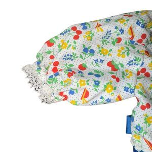 This vintage 70s girls/kids yellow fruit print dress captures the essence of cottagecore fashion with its handmade design and retro 1970s aesthetic. With short sleeves and a casual occasion, this dress is perfect for little ones who love a hippy look. Made from polycotton in the United States, this original piece features a vibrant yellow color that will brighten up any child's wardrobe. The unique fruit print adds a playful touch to this one-size dress, making it a standout choice for vintage-loving parents.