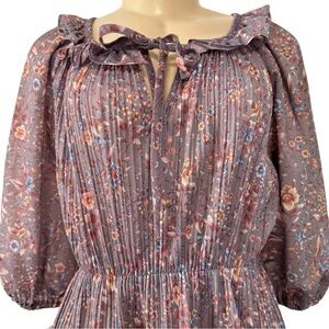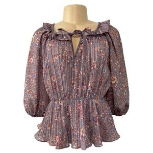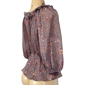 - Gray with Pink Floral Pattern Tie Keyhole Ruffle Neck Pleated Peplum Chiffon 3/4 Bubble Flounce Sleeve