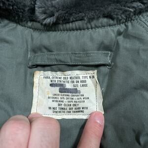 Vintage 1975 U.S. military issue N-3B parka in size Large, manufactured by Lancer Clothing Corporation. Labeled “Parka, Extreme Cold Weather, Type N-3B” with synthetic fur trim on the hood. Slate gray cotton-nylon outer shell with polyester lining. Features include concealed knit cuffs, arm utility pocket with pen slots, button-and-zip storm flap, and adjustable hood strap.