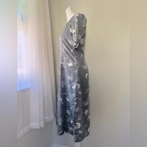 Vintage ‘70s Gray & White Floral Print Short Sleeve Midi Dress w/ Side Slits