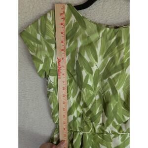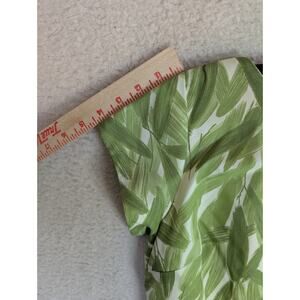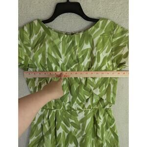 This vintage 1970s Green Leaf Print Sheath Dress in size 8 is a stylish and elegant option for various occasions. Featuring a boat neck and short sleeves, this dress has a zip closure for easy wear. The long dress length and classic sheath style make it perfect for weddings, parties, or casual wear during the summer, fall, or spring seasons. The vibrant green color and leaf pattern add a touch of retro charm to any wardrobe. Made in the USA by ILGWU, this dress is machine washable for easy care and maintenance.