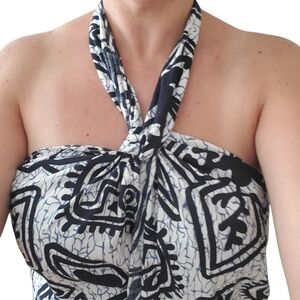 vintage Hukilau Fashions wrap dress, made in Hawaii. Featuring a bold black and white tribal-inspired island print, this strapless maxi dress ties at the neck and features a sexy high front slit for a dramatic silhouette. The 65% polyester / 35% cotton fabric has a lightweight feel with slight texture, perfect for warm-weather getaways, beach vacations, poolside lounging, or tropical events.