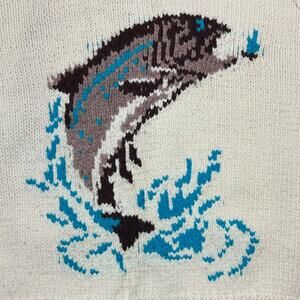 Vintage 70s Hand Knit Cowichan Wool Zip Cardigan Sweater Trout Fish Outdoors XXL