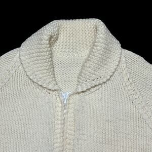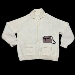 Beautiful hand-knit Cowichan-style zip cardigan featuring a bold leaping trout motif on the back and a creel (fishing basket) design on the front pocket. Crafted from thick natural wool in an off-white tone with brown and blue accent yarns. This piece embodies classic Pacific Northwest fishing lodge style — heavy, cozy, and authentically handmade.